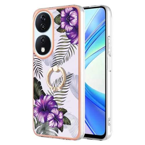 Funda a Prueba de Golpes TPU con Patrón Galvanoplastia y Soporte Anillo para Honor X7B 4G/5G (Flor Morada)