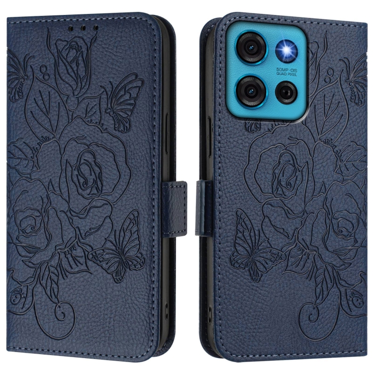 Funda de Cuero Antirrobo RFID con Relieve para Motorola Moto G75 (Azul Oscuro)