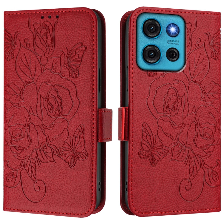 Funda de Cuero Antirrobo RFID con Relieve para Motorola Moto G75 (Rojo)