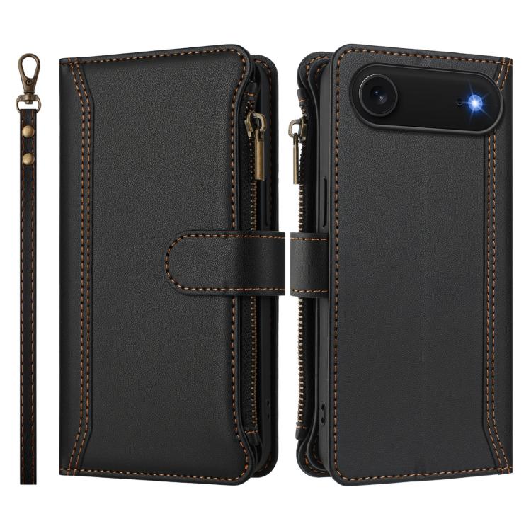 Funda de cuero con cierre magnético para iPhone Air, 9 ranuras para tarjetas, cremallera y correa de mano (negra)