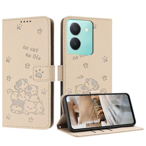 Funda de Cuero con Estampado de Gatito y Cordón para Vivo Y36 4G/5G (Beige)