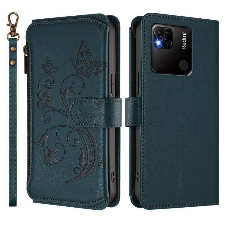 Funda de cuero con cremallera para Redmi 10A/Redmi 9C, diseño de mariposas y flores, con múltiples tarjetas (verde oscuro)