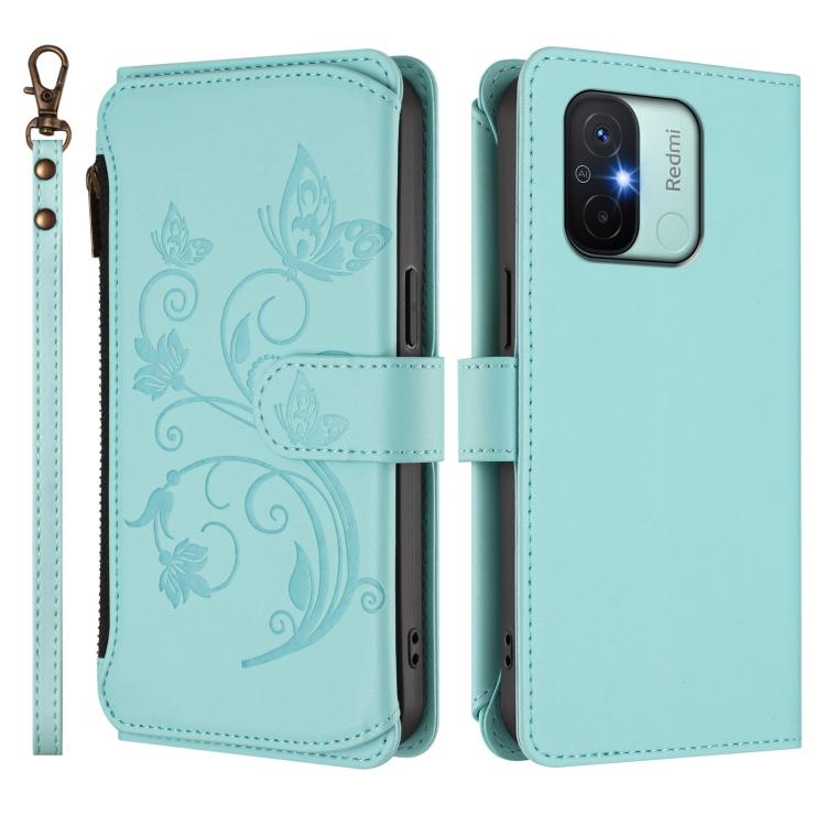 Funda de cuero con cremallera para Redmi 11A / Xiaomi Poco C55, diseño de mariposas, flores y mariposas (verde menta)