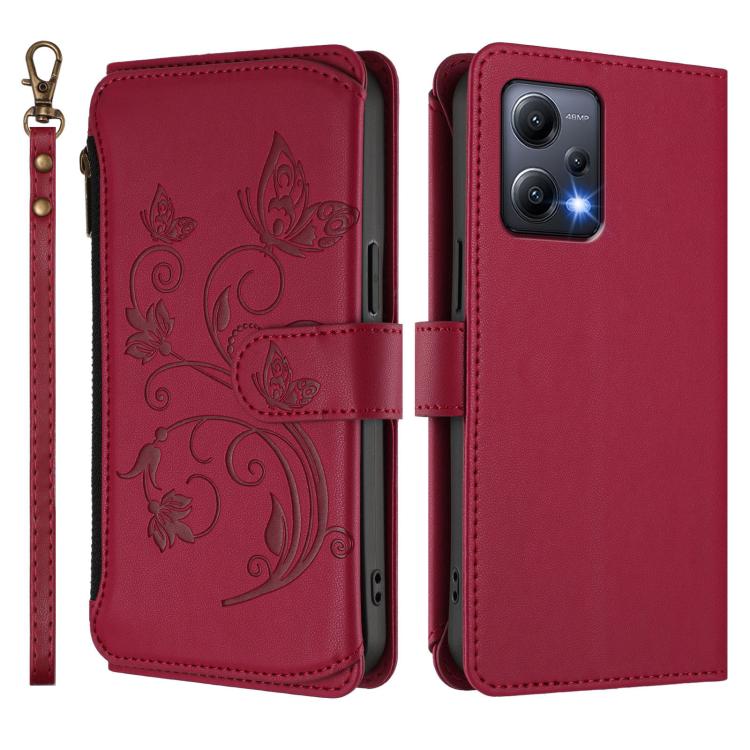 Funda de cuero con cremallera para Redmi Note 12 5G Global / Xiaomi Poco X5, diseño de mariposas, flores y múltiples tarjetas (rojo vino)