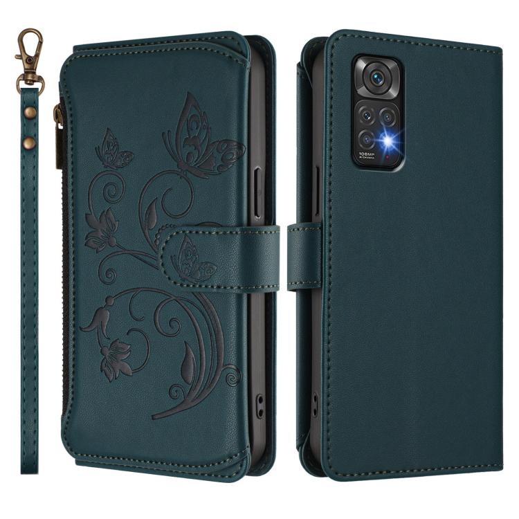 Funda de cuero con cremallera para Redmi Note 12S / Redmi Note 11S 4G, diseño de mariposas, flores y mariposas (verde oscuro)
