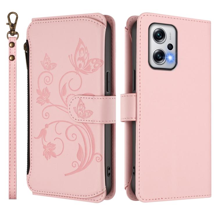 Funda de cuero con cremallera para Redmi Note 12T Pro / Redmi K50i, diseño de mariposas, flores y amor (rosa)