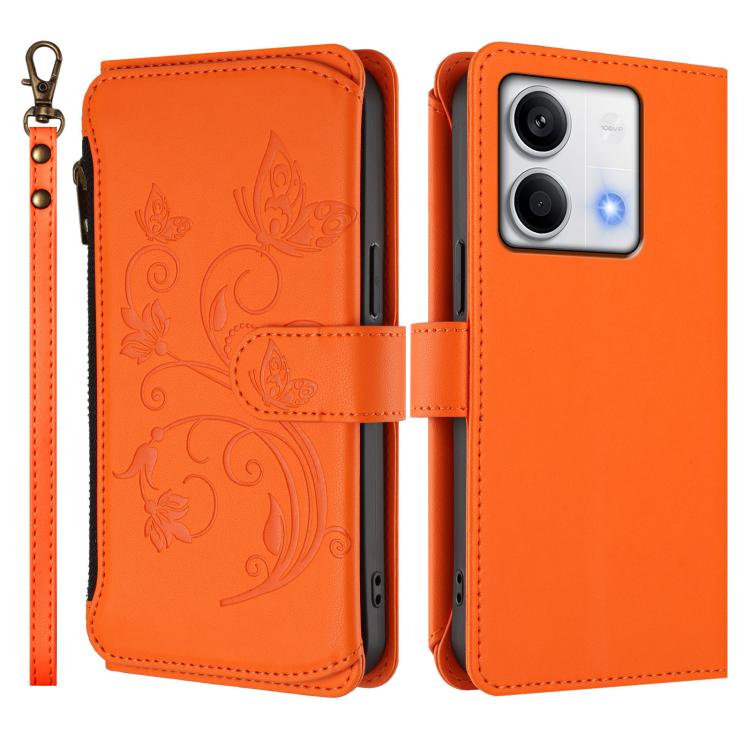 Funda de cuero con cremallera para Redmi Note 13 5G, diseño de mariposas, flores y mariposas (naranja)