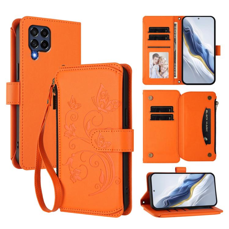 Funda de cuero con cremallera para Samsung Galaxy M53 5G, diseño de mariposas, flores y amor, con múltiples tarjetas (naranja)