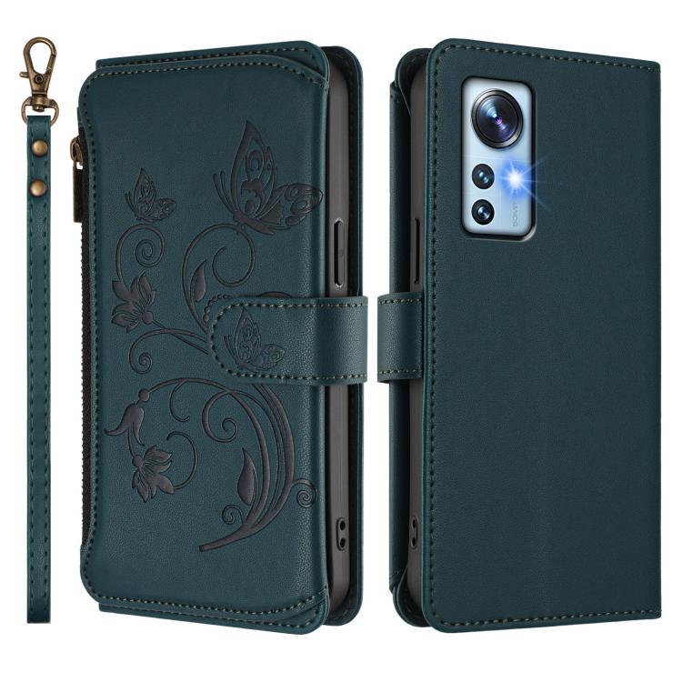 Funda de cuero con cremallera para Xiaomi 12 / Xiaomi 12X / Xiaomi 12S, diseño de mariposas y flores (verde oscuro)