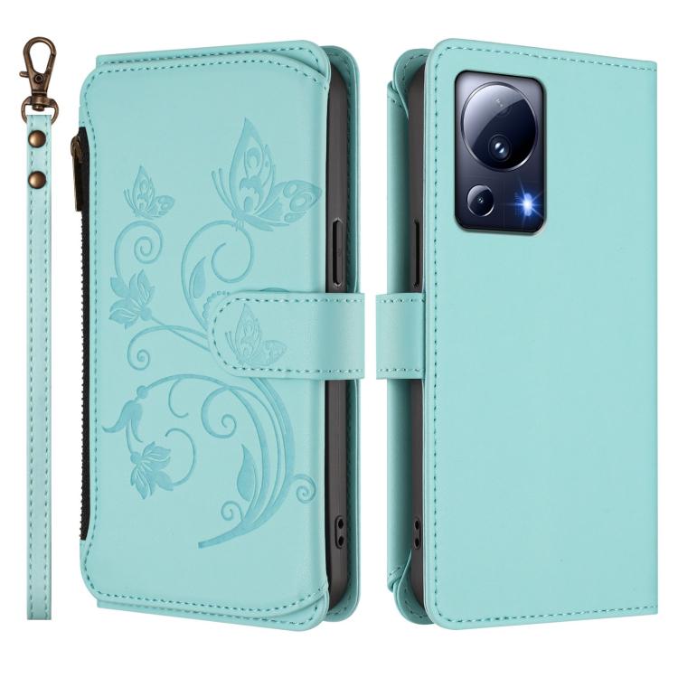 Funda de cuero con cremallera para Xiaomi 13 Lite / Civi 2, diseño de mariposas y flores (verde menta)