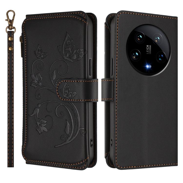 Funda de cuero con cremallera para Xiaomi 14 Ultra, diseño de mariposa, amor y flores, con múltiples tarjetas (negro)