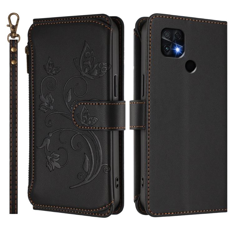 Funda de cuero con cremallera para Xiaomi Poco C40/Redmi 10C, diseño de mariposas y flores, con múltiples tarjetas (negro)