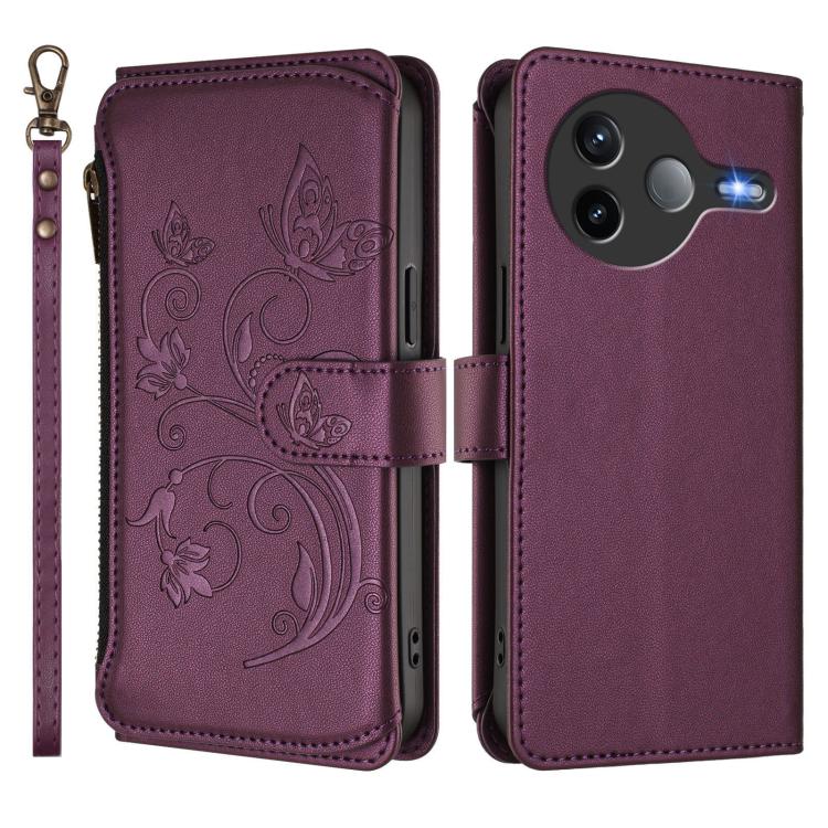 Funda de cuero con cremallera para Xiaomi Poco F7 Pro / Redmi K80, diseño de mariposas, flores y mariposas (morado oscuro)