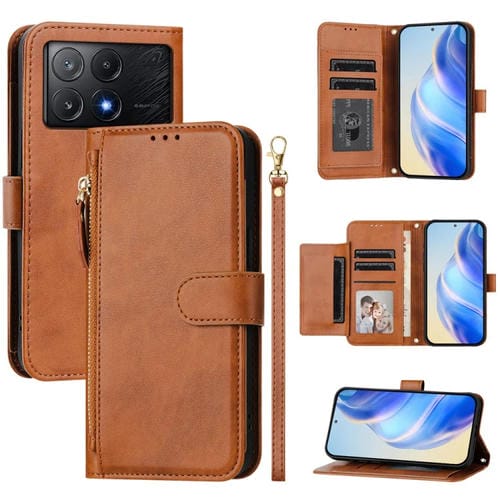Funda de Cuero con Cremallera y Ranuras para Varias Tarjetas para Xiaomi Poco X6 Pro/Redmi K70E (Marrón)