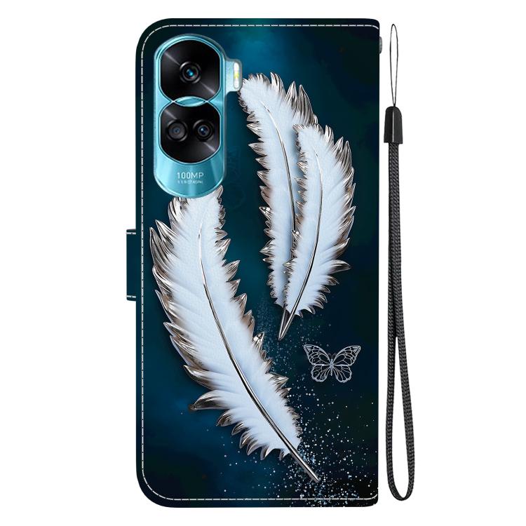 Funda de Cuero para Honor 90 Lite con Dibujo de Colores y Textura de Cristal (Plumas de Mariposa Blancas)