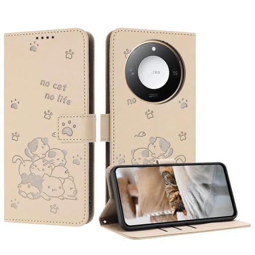 Funda de Cuero para Honor X60/X9C con Diseño de Gatito en Relieve y Cordón (Beige)