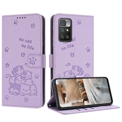 Funda de Piel con Diseño de Gatito En Relieve y Cordón para Redmi 10/10 Prime (Morado)