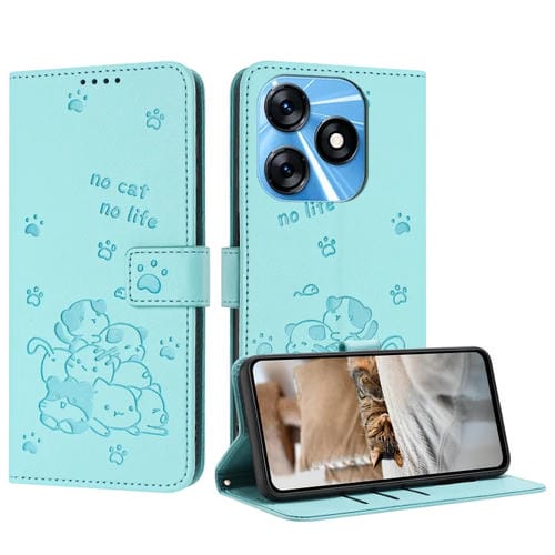 Funda de Cuero para Tecno Spark 10 4G y Spark 10C con Diseño de Gatito en Relieve y Cordón (Verde Menta)