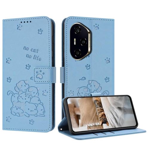 Funda de Cuero Honor 300 Pro con Diseño de Gatito en Relieve y Cordón (Azul)