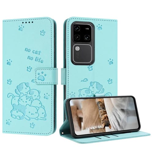 Funda de Piel con Diseño de Gatito En Relieve y Cordón para Vivo S18/S18 Pro (Verde Menta)