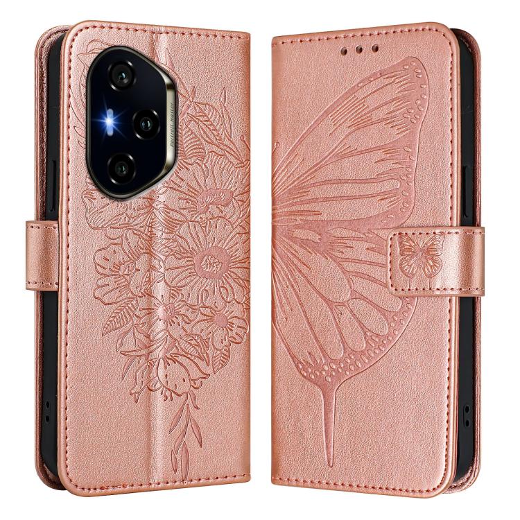 Funda de Cuero para Honor 300 Pro/300 Ultra con Diseño de Mariposa En Relieve (Oro Rosa)