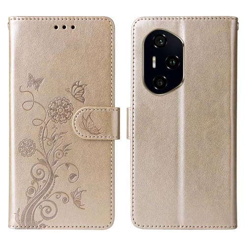 Funda de Cuero Honor 300 Pro con Diseño de Mariposas y Flores en Relieve (Dorada)