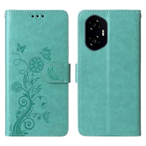 Funda de Cuero para Honor 300 con Diseño de Mariposas y Flores en Relieve (Verde)