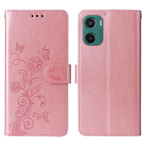 Funda de Cuero Motorola Moto G05/E15 con Diseño de Mariposas y Flores en Relieve (Oro Rosa)