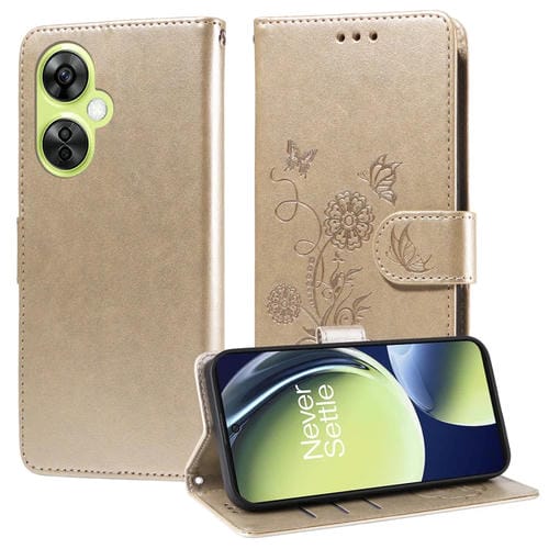 Funda de Cuero OnePlus Nord Ce 3 Lite/Nord N30 con Diseño Mariposas y Flores en Relieve (Dorada)