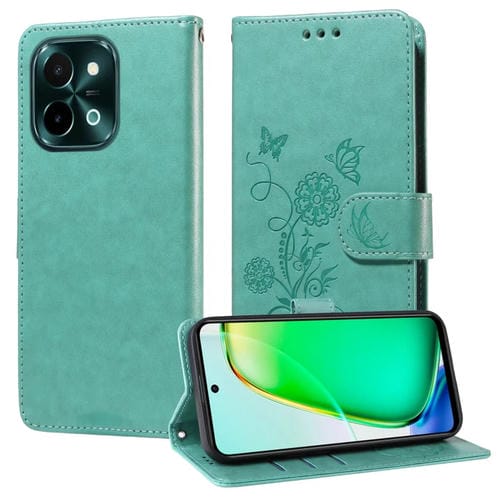 Funda de Cuero con Diseño de Mariposas y Flores En Relieve para Vivo Y28 4G (Verde)