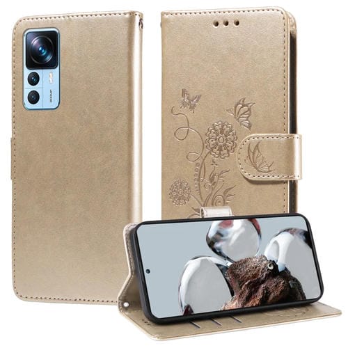 Funda de Cuero con Diseño de Mariposas y Flores En Relieve para Xiaomi 12T / 12T Pro / Redmi K50 Ultra (Dorada)