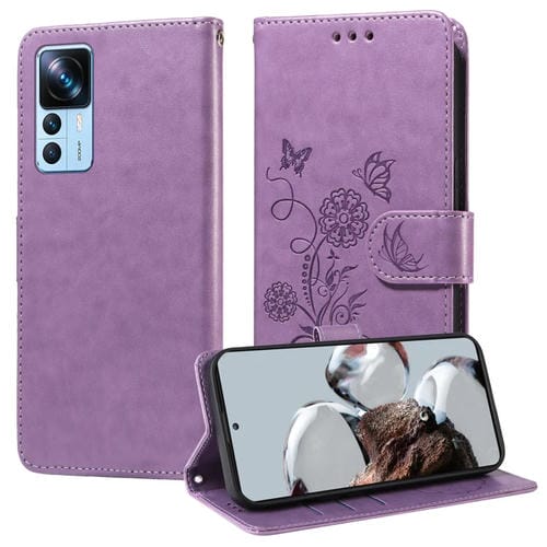 Funda de Cuero con Diseño de Mariposas y Flores En Relieve para Xiaomi 12T / 12T Pro / Redmi K50 Ultra (Morado)