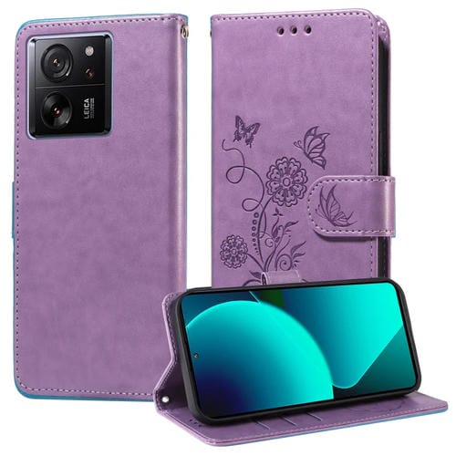 Funda de Cuero con Diseño de Mariposas y Flores En Relieve para Xiaomi 13T/13T Pro/Redmi K60 Ultra (Morado)