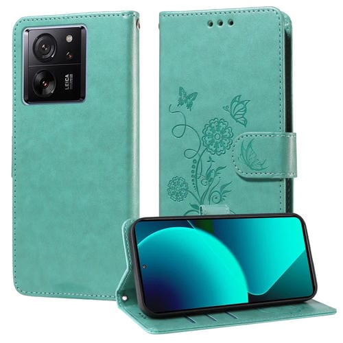 Funda de Cuero con Diseño de Mariposas y Flores En Relieve para Xiaomi 13T / 13T Pro / Redmi K60 Ultra (Verde)
