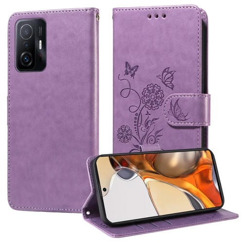 Funda de Cuero con Diseño de Mariposas y Flores En Relieve para Xiaomi Mi 11T/11T Pro (Morado)