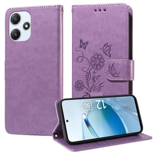 Funda de Cuero con Diseño de Mariposas y Flores En Relieve para Xiaomi Poco M6 Pro 5G (Morado)