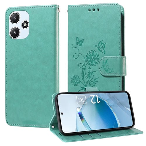 Funda de Cuero con Diseño de Mariposas y Flores En Relieve para Xiaomi Poco M6 Pro 5G (Verde)