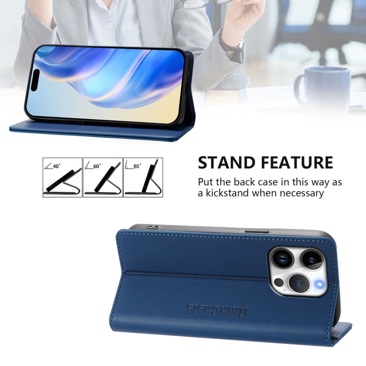 Funda de Cuero Rc01 para iPhone 16 Pro Max Doble Pliegue y Succión Magnética (Azul Oscuro)