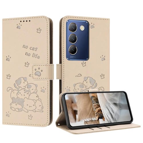 Funda de Cuero con Estampado de Gatito y Cordón para Vivo Y100 Idn / Y200E 5G (Beige)