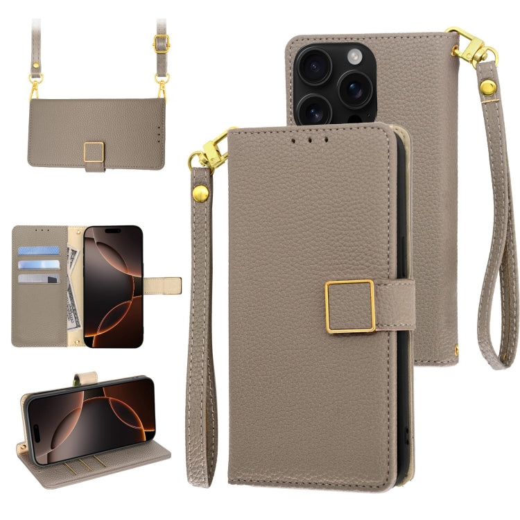 Funda de Cuero con Hebilla Cuadrada y Textura de Lichi para iPhone 16 Pro (Marrón)