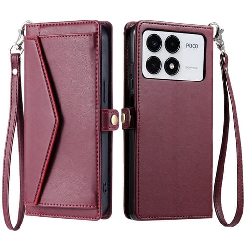 Funda de Cuero con Ranura para Múltiples Tarjetas y Cordón para Xiaomi Poco F6 Pro (Rojo Vino)