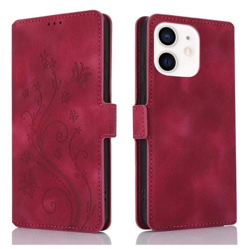 Funda de Cuero iPhone 12 Mini Relieve Mariposa y Flor Amor Ensueño (Rojo)