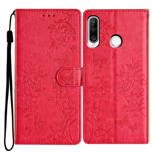 Funda de Cuero con Relieve Mariposa y Flor para Huawei P30 Lite (Rojo)