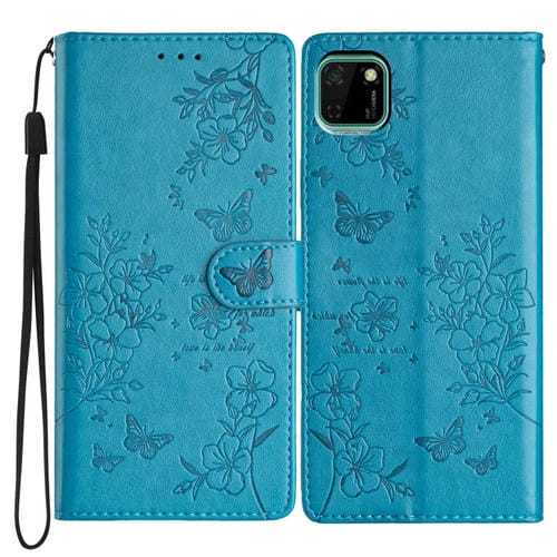 Funda de Cuero con Relieve Mariposa y Flor para Huawei Y5P (Azul)