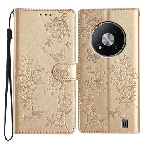 Funda de Cuero con Relieve Mariposa y Flor para ZTE Blade A73 5G (Dorada)