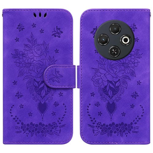 Funda de Cuero con Relieve Mariposa y Rosa para Tecno Spark 30C (Morado)