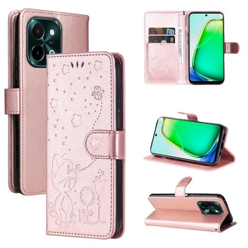 Funda de Cuero con Tapa con Diseño de Gato y Abeja En Relieve para Vivo Y28 4G (Oro Rosa)