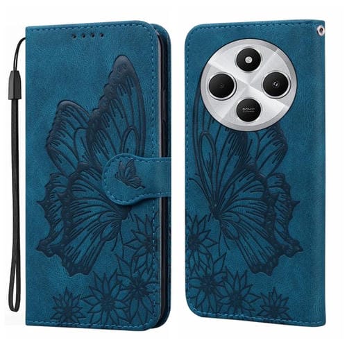 Funda de Cuero con Tapa Horizontal y Diseño de Mariposas En Relieve con Tacto Retro para Redmi A4 5G (Azul)