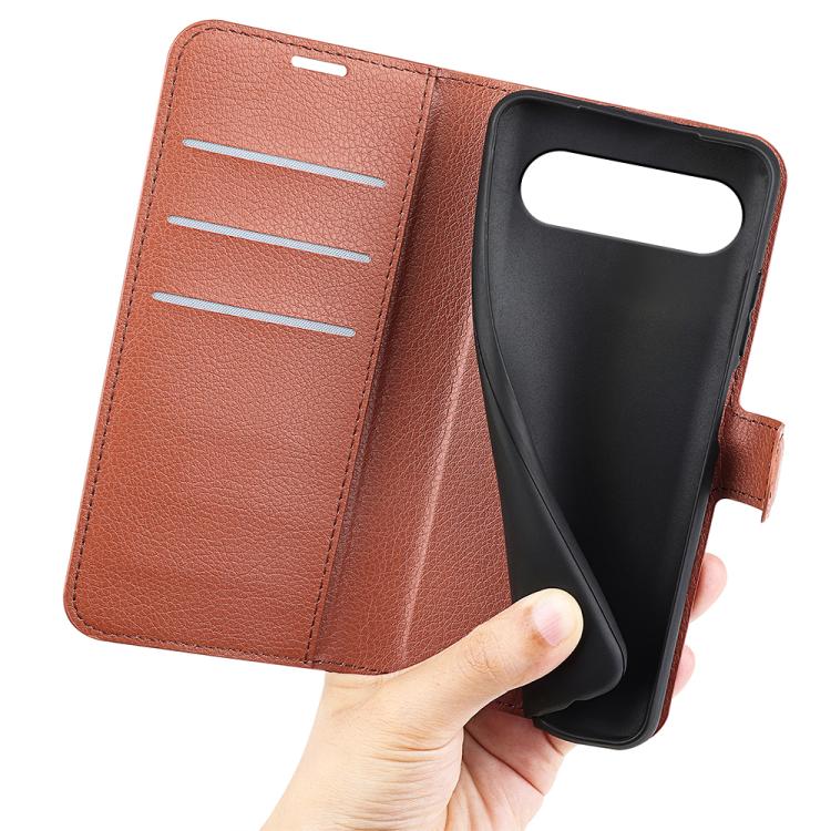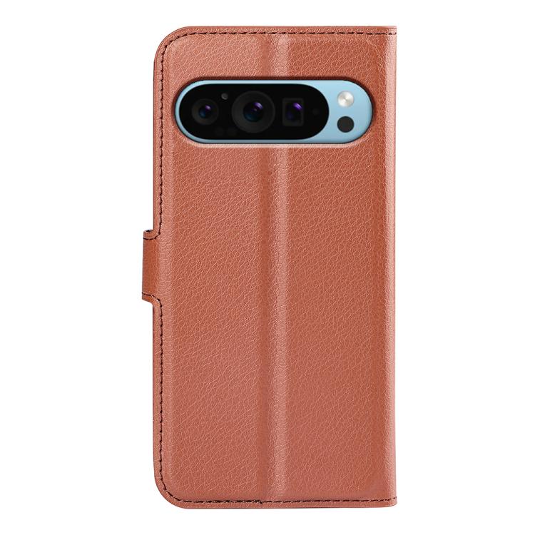 Funda de Cuero con Tapa Horizontal y Textura de Lichi para Google Pixel 9/9 Pro con Soporte (Marrón)