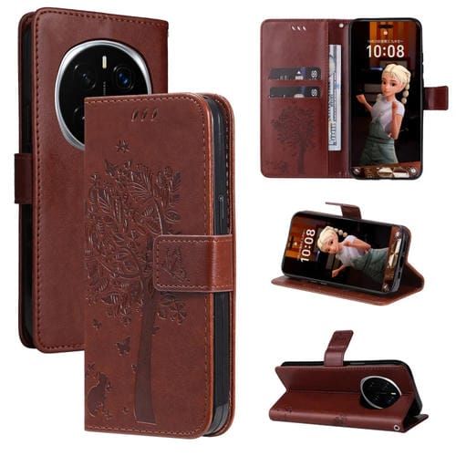 Funda de Cuero con Tapa para Honor Magic7 Pro Diseño Árbol y Gato En Relieve (Café)